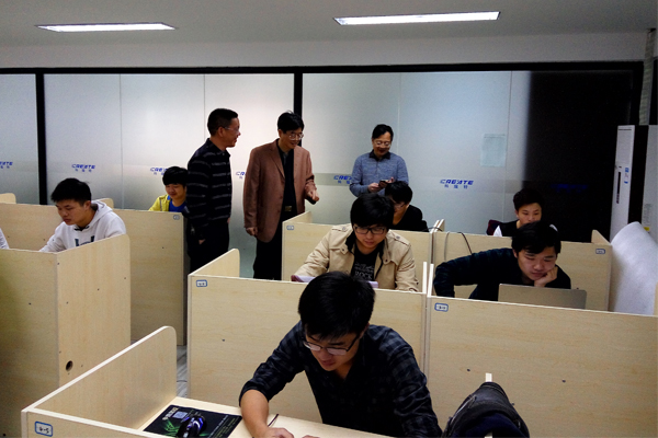 2016年4月14日上午,湖南机电职业技术学院党委书记成书记、电气工程学院谭院长等一行3 人来到科瑞特公司,并在科瑞特董事长张玉希的陪同下对学员的到课情况进行了“暗访”考察。已经 学习了一个半月的学员们和往常一样9点之前到达培训教室,进行了指纹考勤,然后打开电脑,继续未完成的项 目程序设计等任务,没有一位迟到或者缺勤。看到这种良好的学习氛围,成书记表示非常满意,并好奇的询问到 :“学生在企业的学习劲头和状态为什么会大大强于学校?”